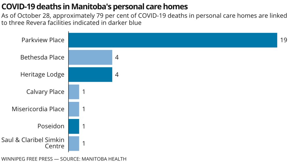 Heritage Lodge, one of several Winnipeg care facilities operated by Revera, had its first reported case of coronavirus on Sept. 24 and moved to outbreak status two days later when the number of residents infected grew to five.