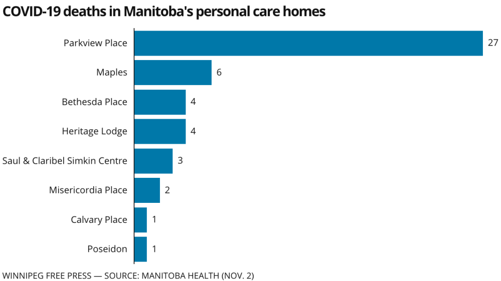The outbreak at Parkview Place long-term care home has 138 total cases (106 residents) and 23 deaths; Maples care home as 146 total cases (117 residents) and six deaths; Heritage Lodge has 20 total cases (15 residents) and four deaths; and Misericordia Place has 20 total cases (12 residents) and two deaths.