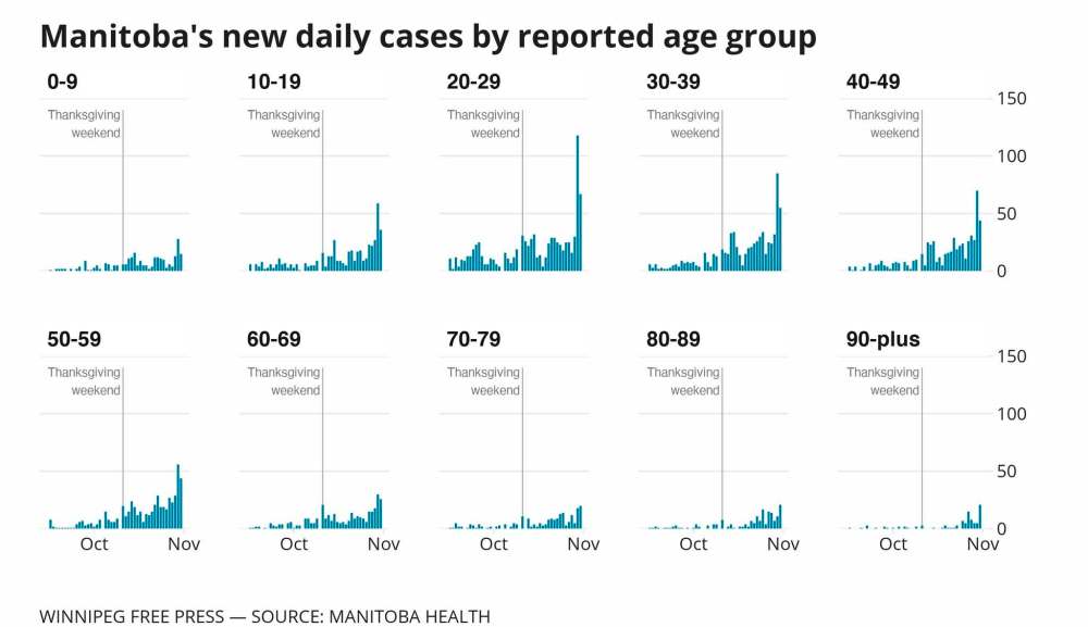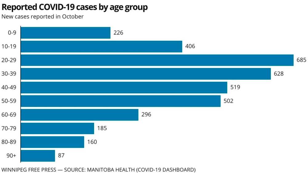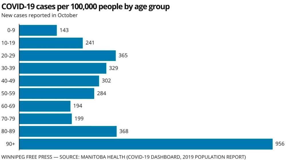 At 368 cases per 100,000 people, the rate for new cases of COVID-19 reported in October is highest among Manitobans over 80. And particularly in the latter half of October, after a Thanksgiving spike, the rate at which 20- to 29-year-olds contracted the virus wasn’t significantly higher than those in their 30s, 40s or 50s.