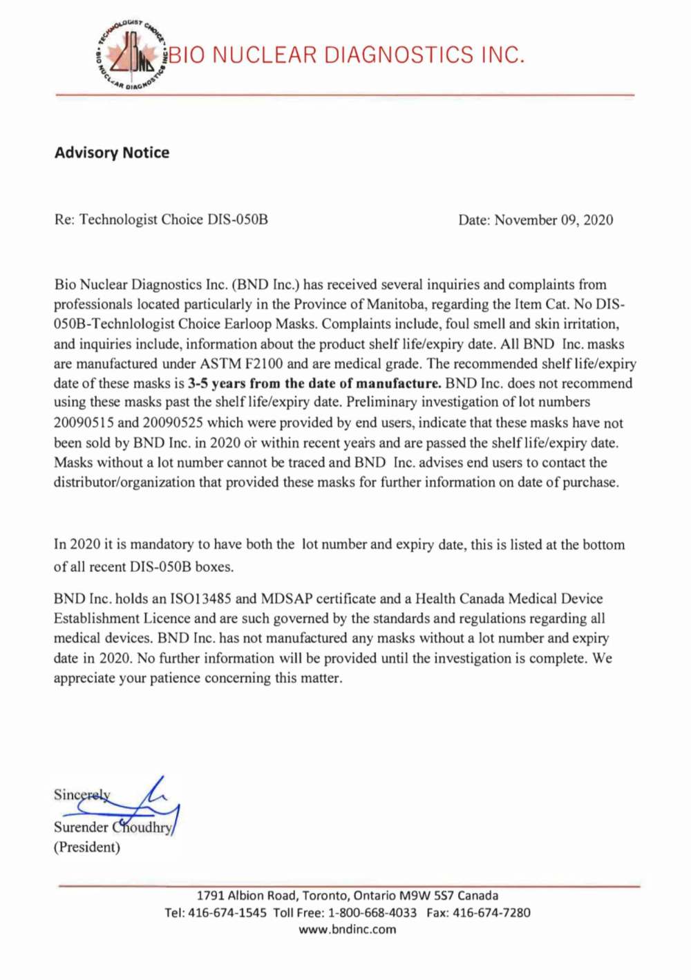 In an advisory note dated Nov. 9, Bio Nuclear president Surender Choudhry addressed concerns the company has received from Manitoba in recent days.