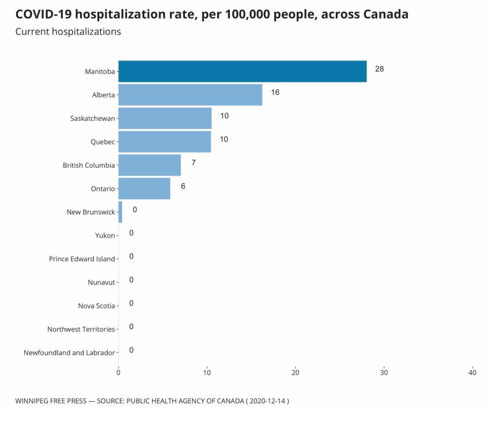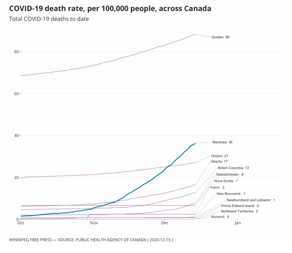 As of Dec. 13, Manitoba had 36 deaths per 100,000 people, second to Quebec’s 88. Ontario had 27. Alberta, considered Canada’s COVID-19 hotspot in recent weeks, had only 16. British Columbia had 12.