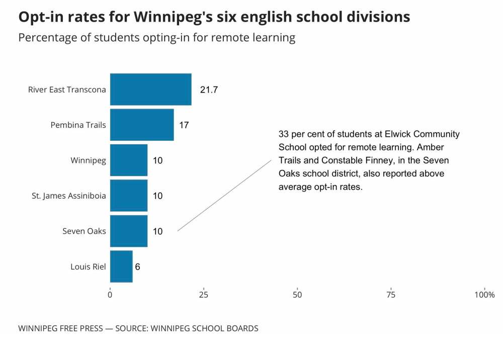 Overall, Louis Riel had the lowest opt-in rate of all K-8 student populations in English metro divisions, with six per cent of learners choosing to study at home. That figure is 22 per cent in River East Transcona.