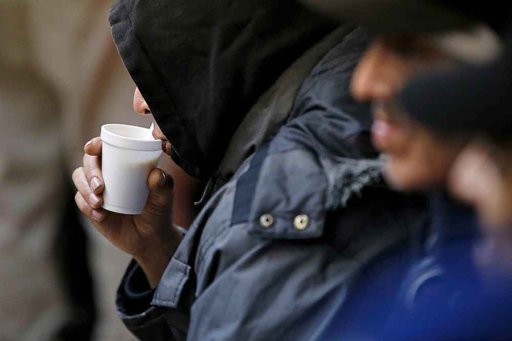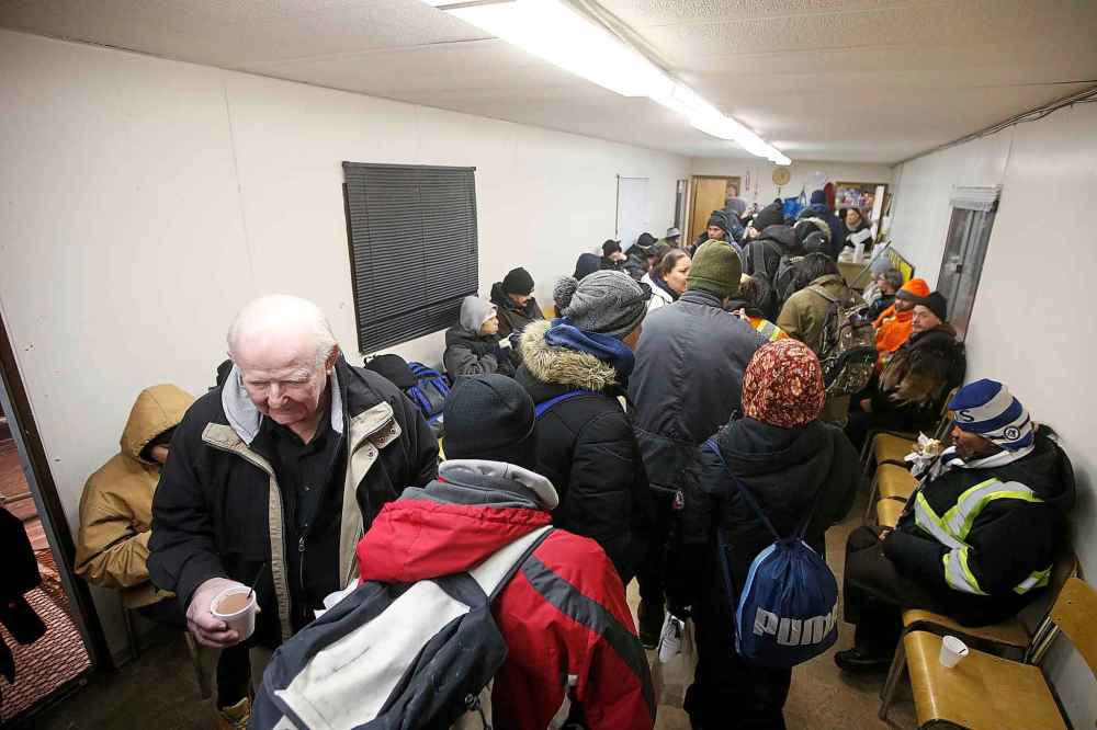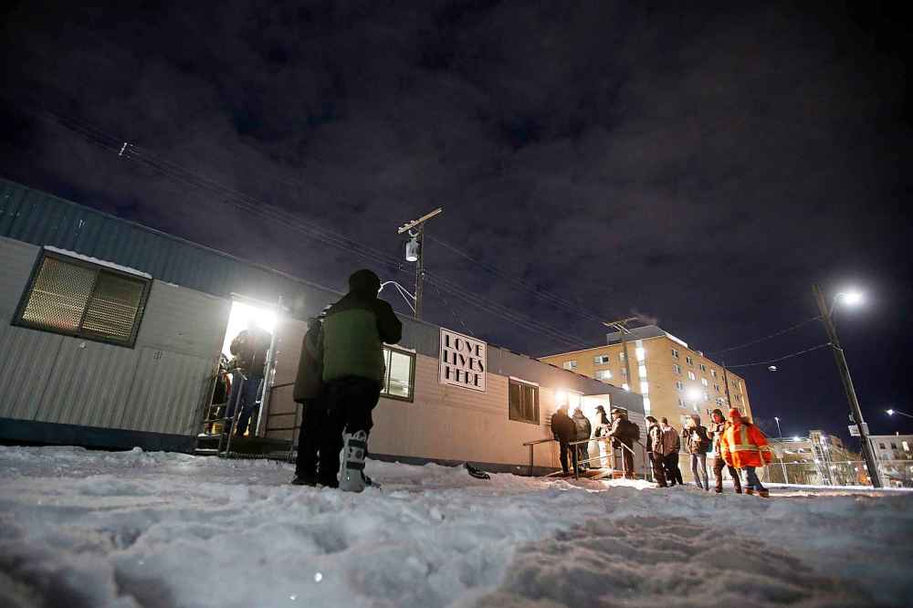 Outside the trailer, a man sits in the snow, smoking a cigarette and drinking a plastic bottle of beer. In between puffs, he coughs, then mumbles to himself as a lineup begins to form at the door.