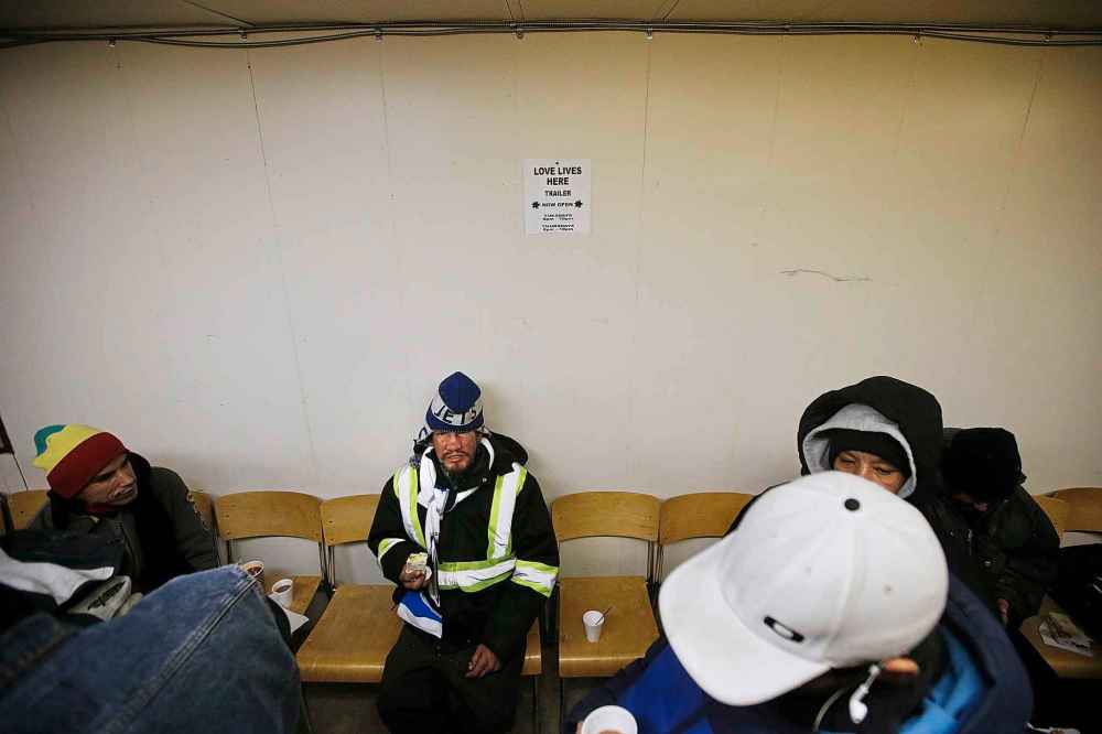 Inside, the trailer is warm, and the service just getting underway. Martens stands off to the side, talking to a man and asking about his hernia and his plans for the upcoming operation. He asks whether the man has a place to store his belongings while he’s in hospital.