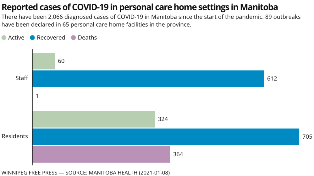 Vulnerable seniors living communally in personal-care homes in Winnipeg, elsewhere in the province and across Canada have been easy targets for the virus; 364 residents and one staff member have died in Manitoba long-term care facilities. Another 1,029 residents and 672 workers either currently have, or had, COVID-19.