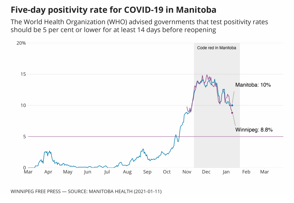 There are still troubling signs the virus is circulating at high levels, especially in northern communities. Manitoba’s test-positivity rate remains high at 10 per cent. (Although it’s fallen to 8.8 per cent in Winnipeg — the lowest it’s been since early November).