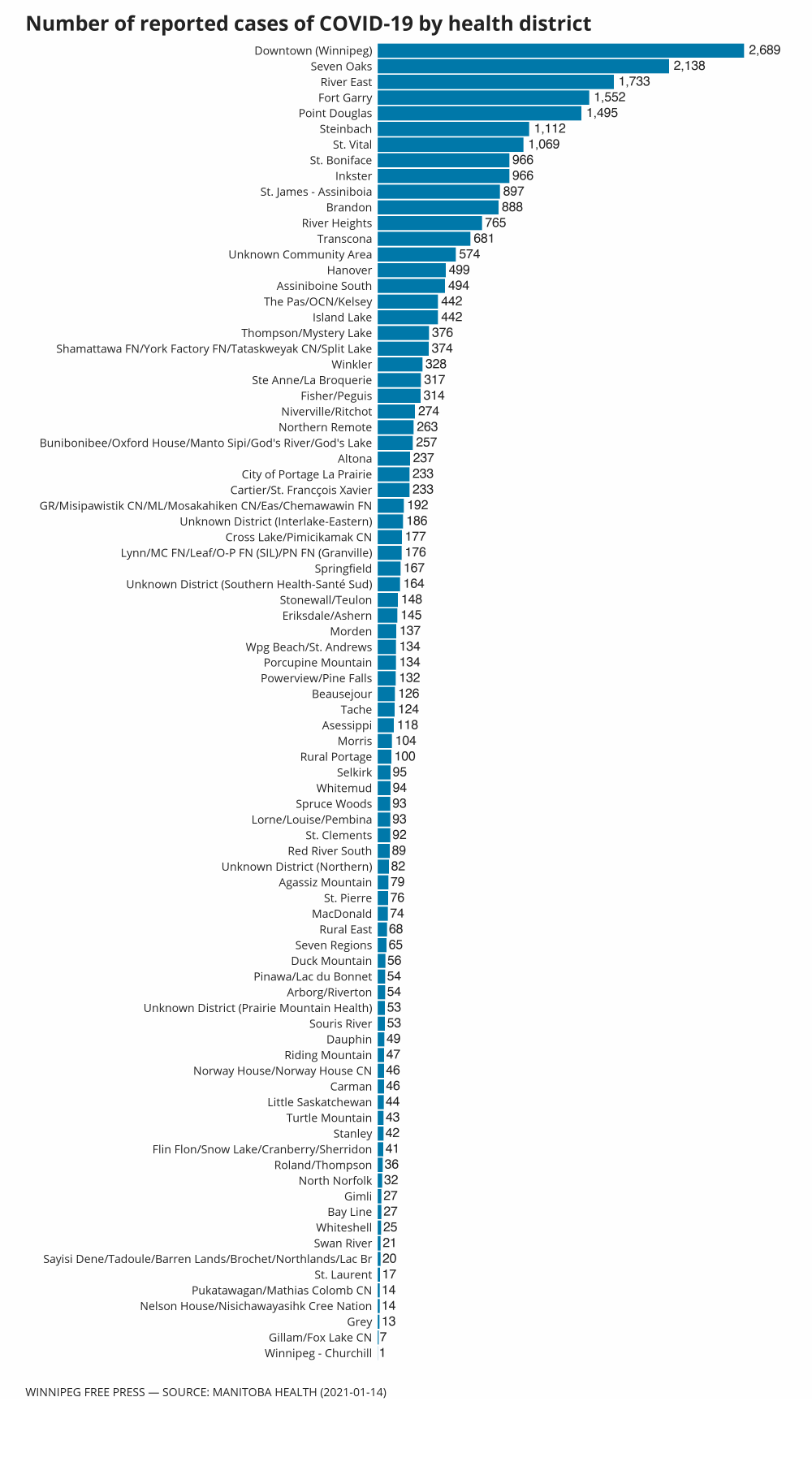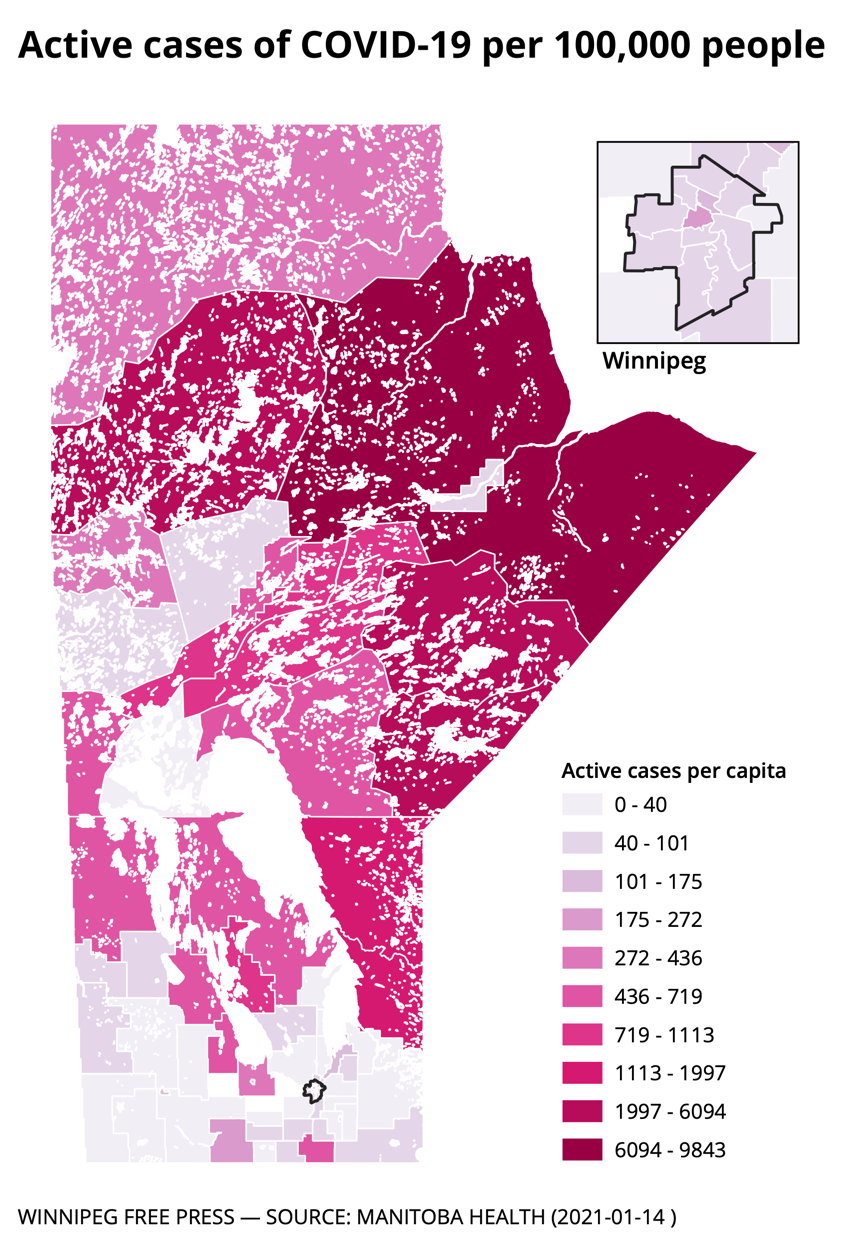 Four of the five health districts in Manitoba with the most active cases of COVID-19 are in the northern region. Island Lake tops the list, with 355 active cases in a population reported by the province to be 9,008. This puts it at 3,941 active cases per 100,000 people. In comparison, downtown Winnipeg, the only district in Winnipeg to make the top five list, has 272 cases per 100,000 people.