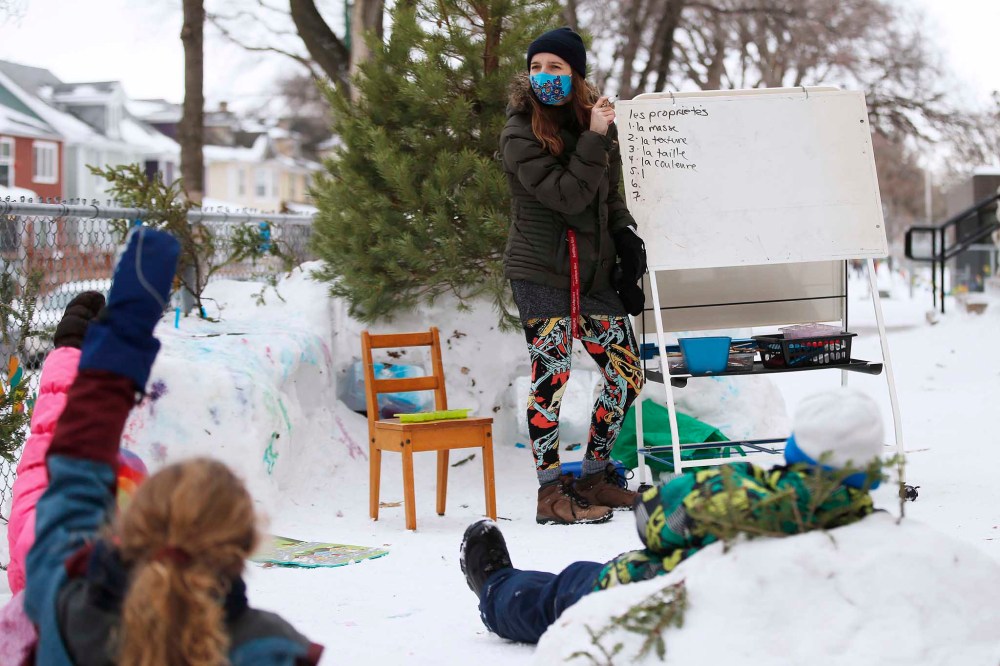 “What happens to our masks when we breathe outside?” Lamont asked her Grade 4/5 immersion students, each one seated in a homemade snow seat in their outdoor classroom, during a natural sciences lesson taught in French.