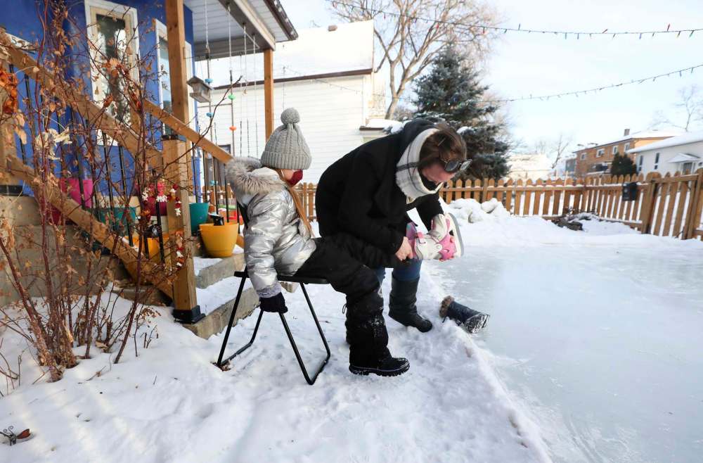 Krystal Payne helped her eight-year-old daughter suit up at the edge of their front yard skating rink in Elmwood, one of several features of the family’s homemade winter wonderland, which includes a snow fort that doubles as a miniature tobogganing hill.