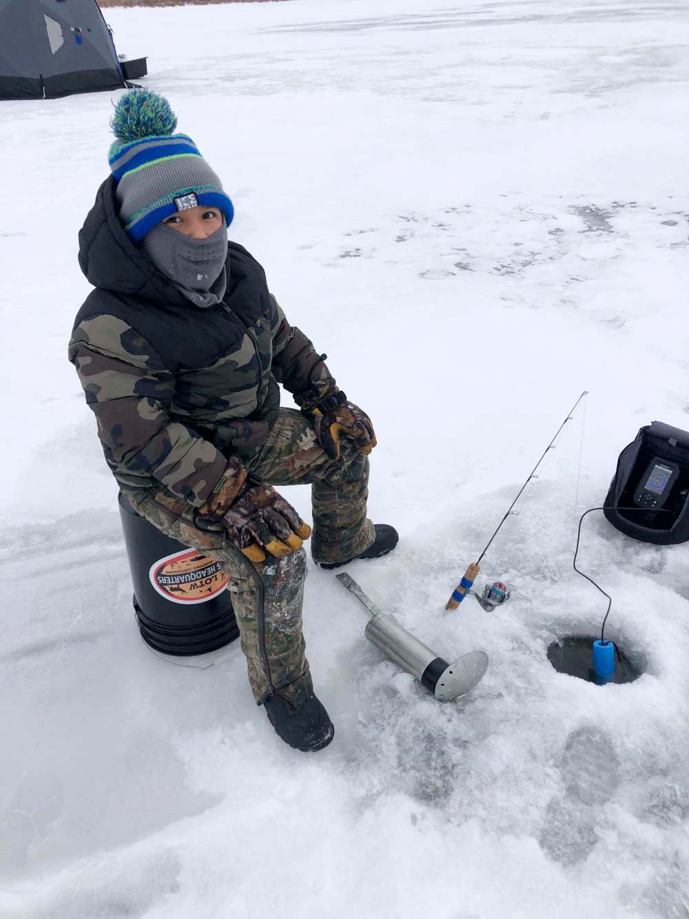 Sunday marked Anna’s first time ice fishing so Carter showed her the lines; the fourth grader explained that because they were using frozen minnows, she needed to jiggle her rod to lure fish to the bait.
