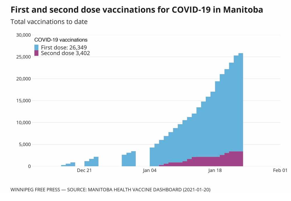 To date, Manitoba has received 55,650 doses of vaccine, including 40,950 Pfizer doses and 14,700 Moderna. So far, Manitobans have received 29,751 doses. The province said 37,522 vaccinations are planned in the next 28 days.
