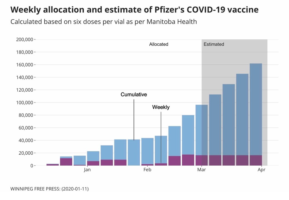 For example, the projection Ottawa shared with provinces Wednesday, shows that Ottawa expects Manitoba would get enough trays of Pfizer vials to administer 134,550 doses, but Manitoba counts that as 161,460 shots.