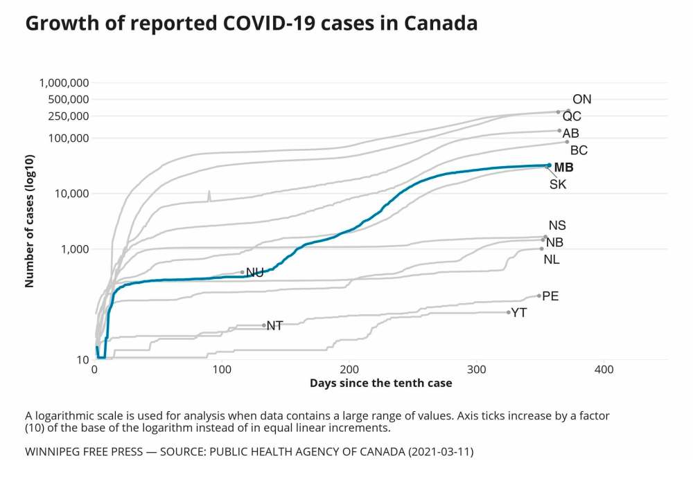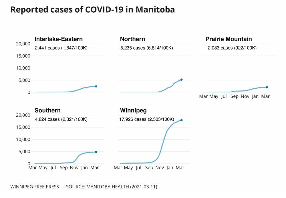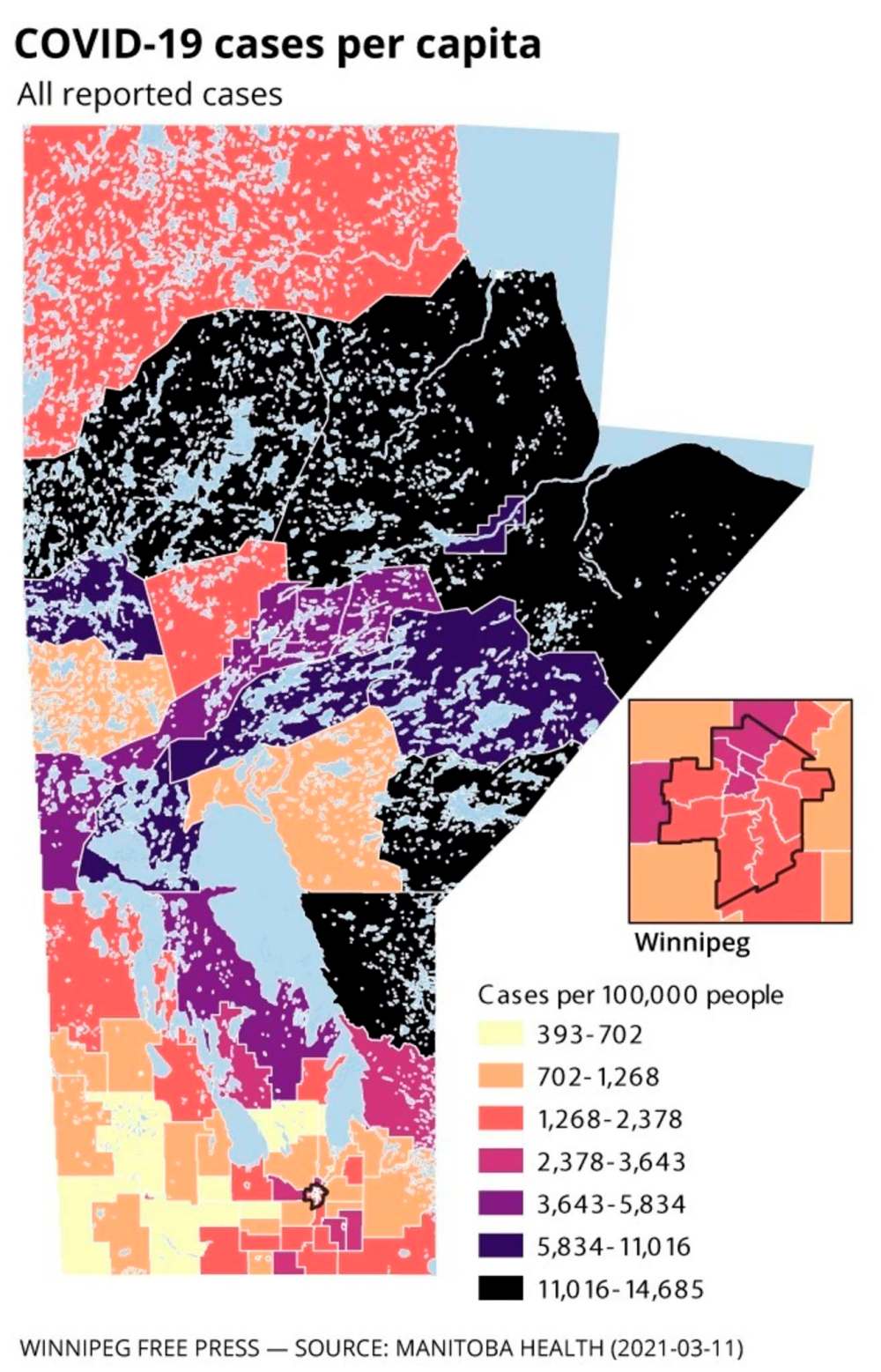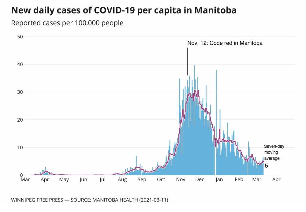 In comparison to other Canadian provinces, Manitoba was fourth in total cases per capita as of March 11, with 2,350 per 100,000 people. Leading the pack is Quebec, followed by Alberta and Saskatchewan.