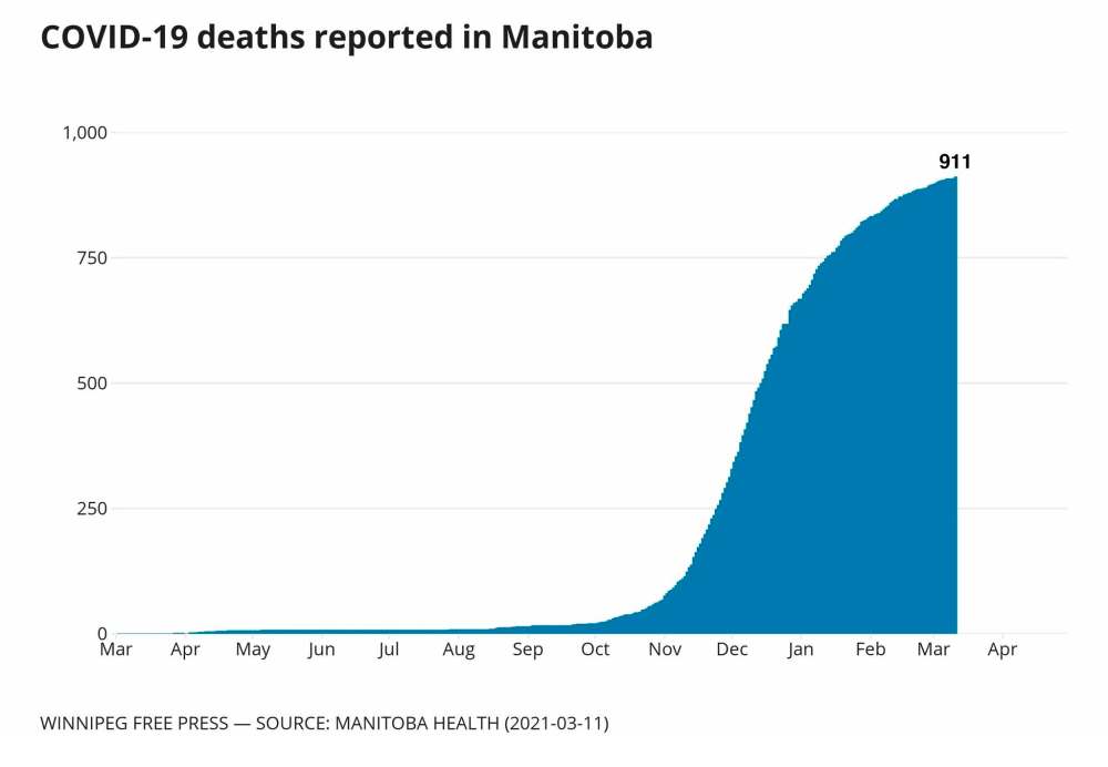 On Thursday, one year to the day the World Health Organization declared a global pandemic, Manitoba reported three more deaths due to COVID-19, pushing the province’s death toll to 911.
