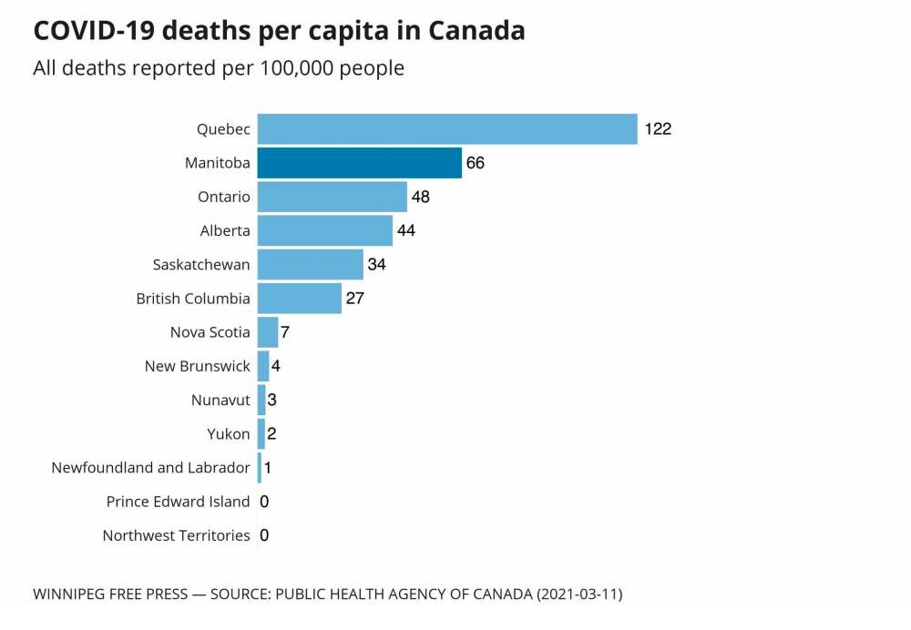 In comparison to other Canadian provinces and territories, Manitoba had the second-highest COVID-19 death rate per capita as of March 11, with 66 fatalities per 100,000 people. Quebec held the top spot at 122.