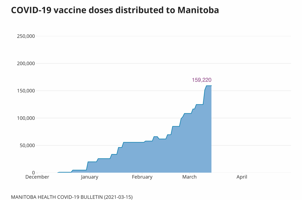 Between March 29 and April 12, based on the latest delivery schedule from the province, Manitoba expects to receive 115,800 doses. In the next 28 days, the province has already planned 183,347 immunizations.