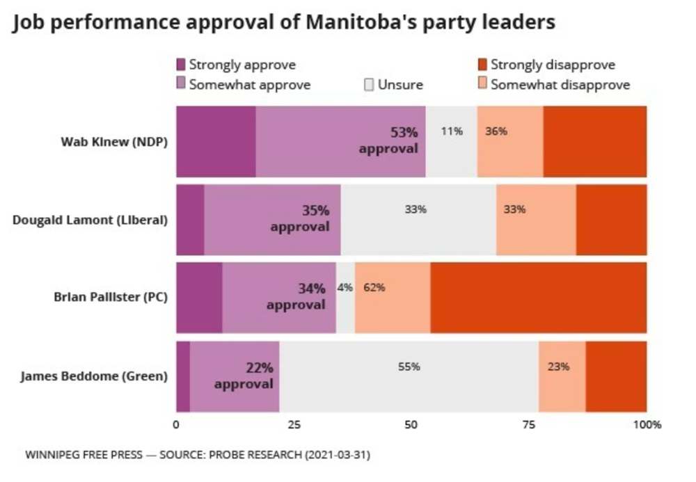 In Winnipeg, where provincial elections are won or lost, Pallister had the approval of only 30 per cent of respondents (68 per cent disapproved), while Kinew’s performance was given a thumbs up by 61 per cent of those polled (30 per cent disapproved).