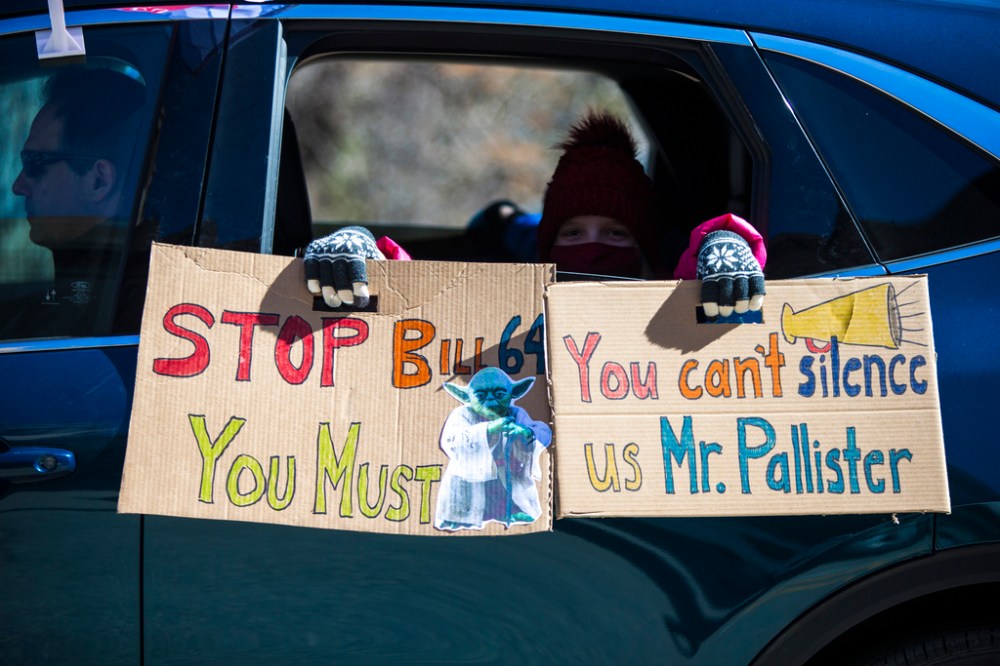 Among the hundreds of drivers and passengers who hitched rides to a honk-a-thon against the Education Modernization Act was a protester carrying a homemade report card for Premier Brian Pallister; it bore a giant red “F.”