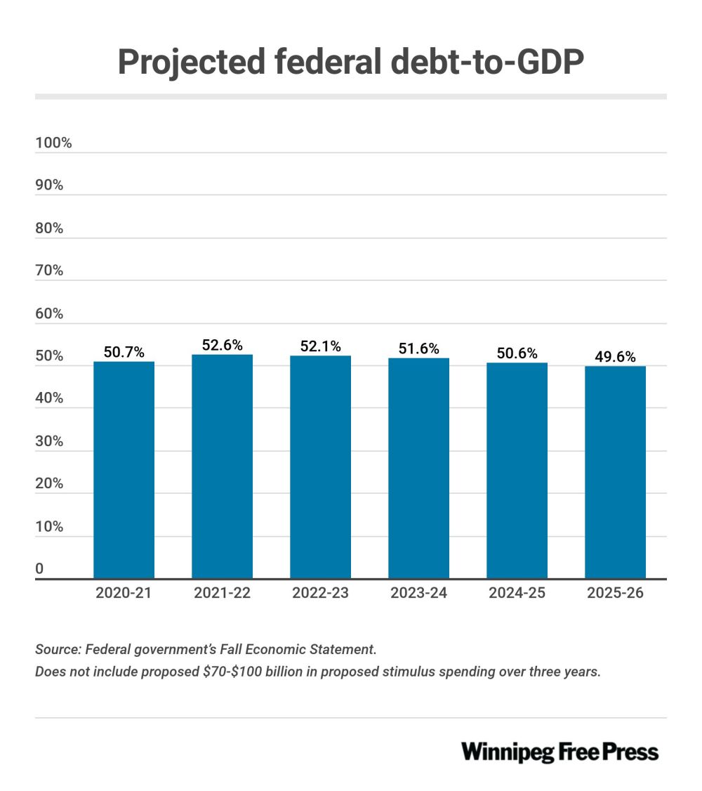 Freeland, meanwhile, has already committed $70 to $100 billion in stimulus spending over the next three years to kick-start the economy. That’s expected to be a key part of the 2021 budget. Those dollars have not been factored into the Finance Department’s fiscal framework (they will be on budget day). But the department did release some estimates: if the full $100 billion is spent, the debt-to-GDP ratio could climb as high as 59 per cent.