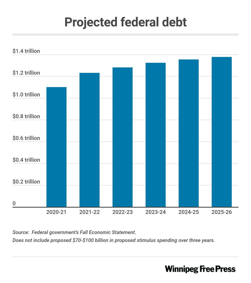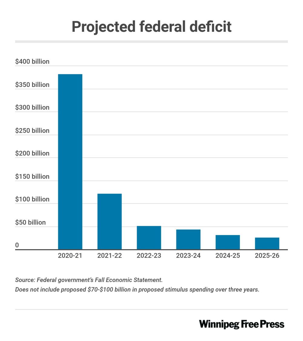 Ottawa is projecting a deficit of $381 billion for 2020-21, about 10 times the size of its shortfall the previous year. (Canada’s parliamentary budget officer predicted a slightly smaller deficit of $363 billion in its March update). The federal debt is projected to balloon to a record $1.1 trillion and is expected to grow for at least five years.
