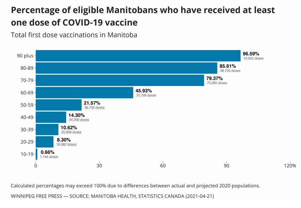 The province has already missed its targets to immunize Manitobans ages 60 to 69. Manitoba was supposed to have first shots in 70 per cent of people in that age group by April 15.