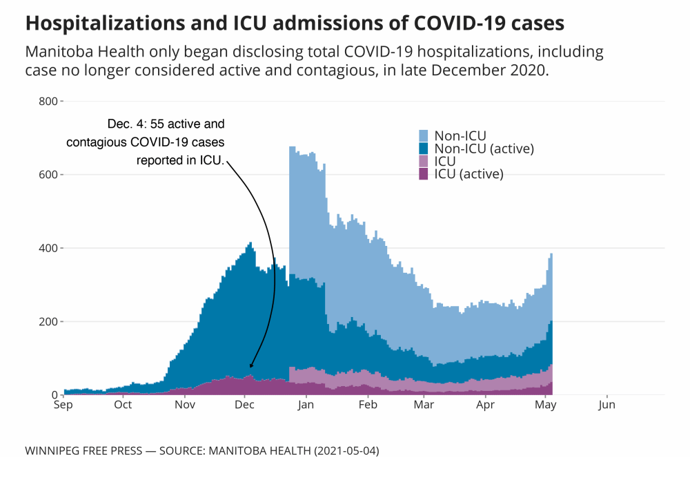 During the peak of Manitoba’s second-wave hospitalizations in early December, more than 350 COVID-19 patients were in hospital and more than 50 were in ICUs. The number of total ICU patients peaked at 129 Dec. 10.