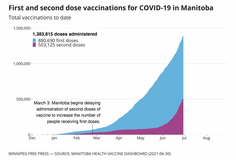 When counting all first doses recorded on the province’s dashboard, 74.9 per cent of Manitobans had received their first shot as of Wednesday.