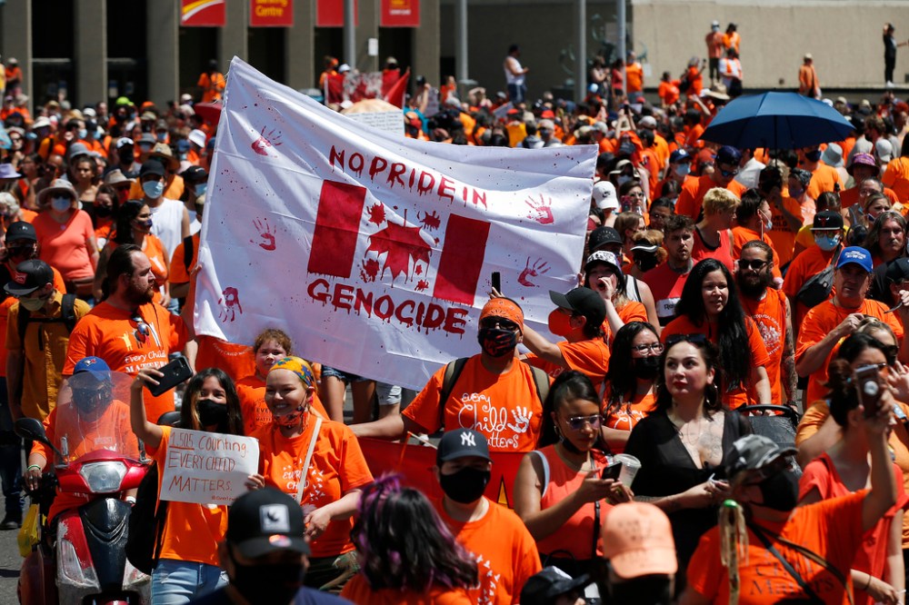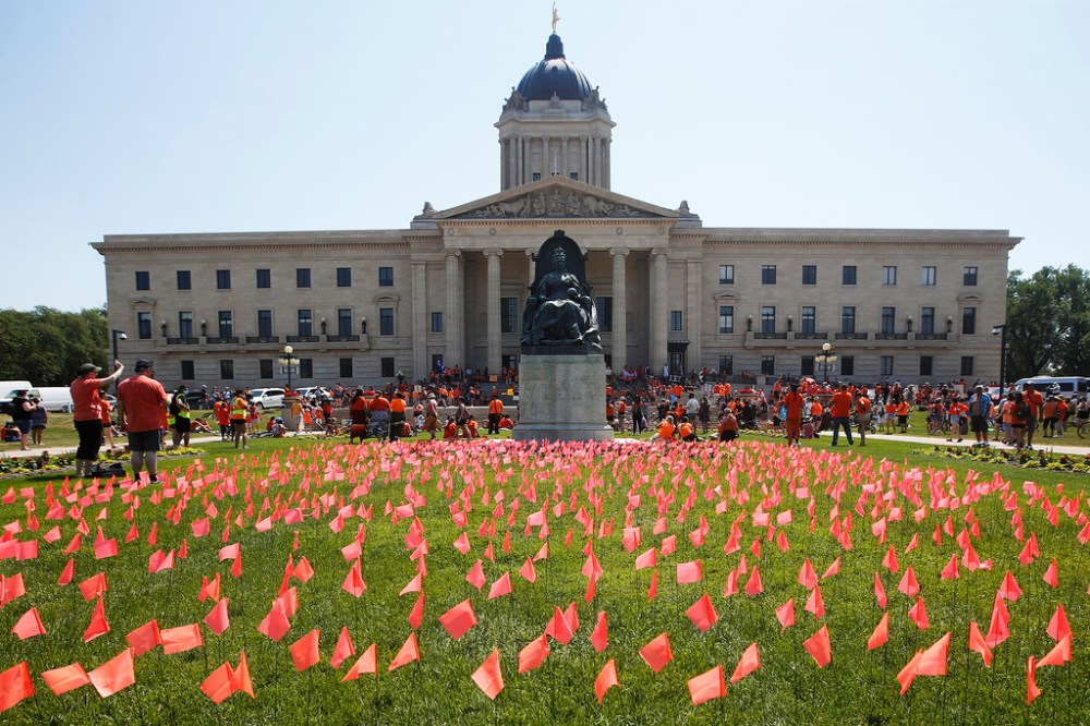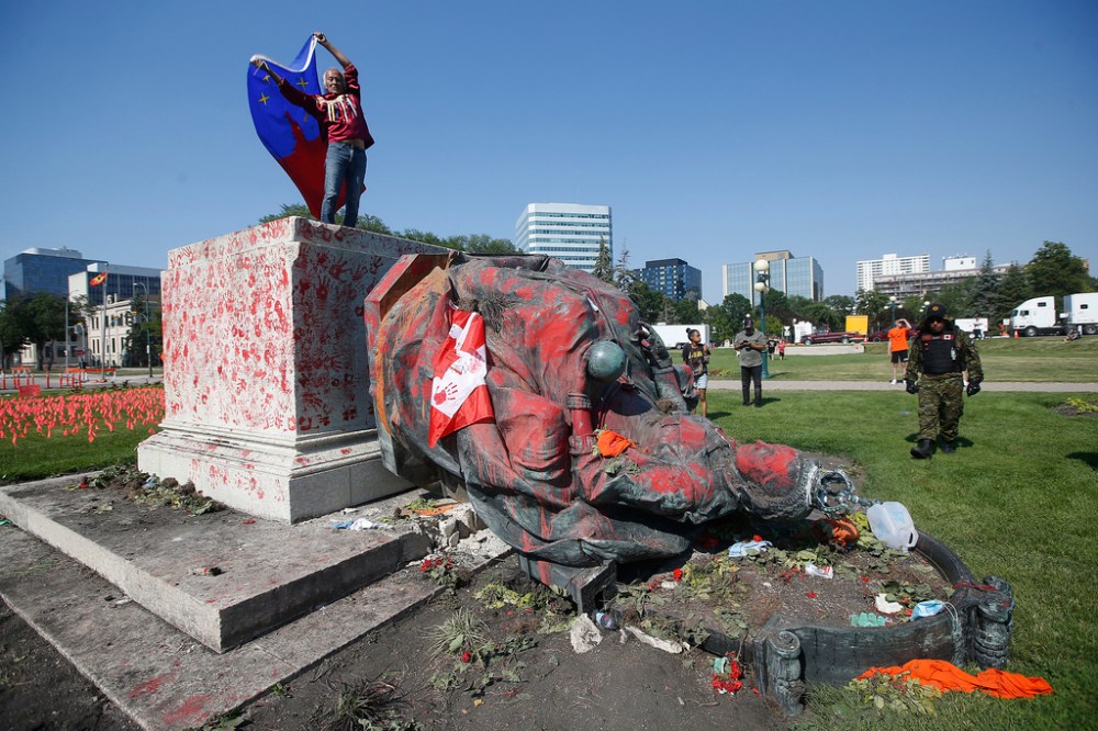 A day that began with rallies that flooded streets orange in honour of bodies buried in unmarked graves at residential schools ended with the toppling of a statue that has stood for more than a century in front of Manitoba’s legislative building.
