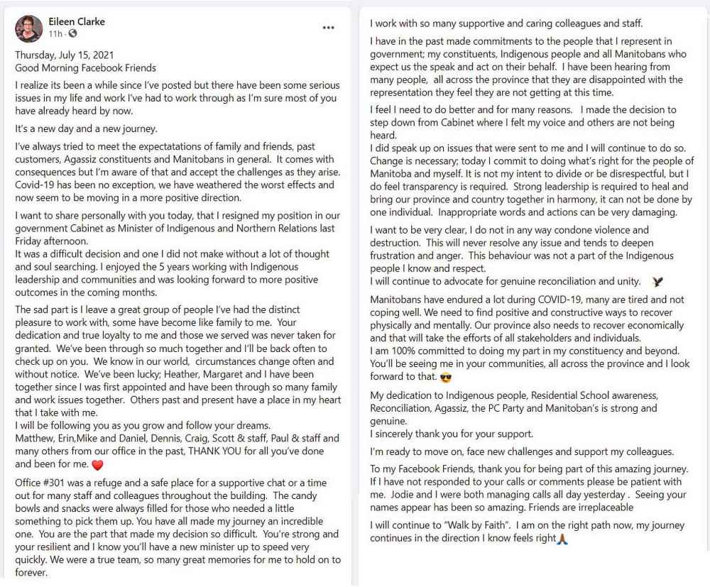 A respected member of cabinet and an opinion leader within the Progressive Conservative party in western Manitoba, Clarke’s decision to step down as a minister to protest Pallister’s recent abhorrent comments about colonial settlers and Indigenous protesters is as unflattering for the premier as it is seismic.