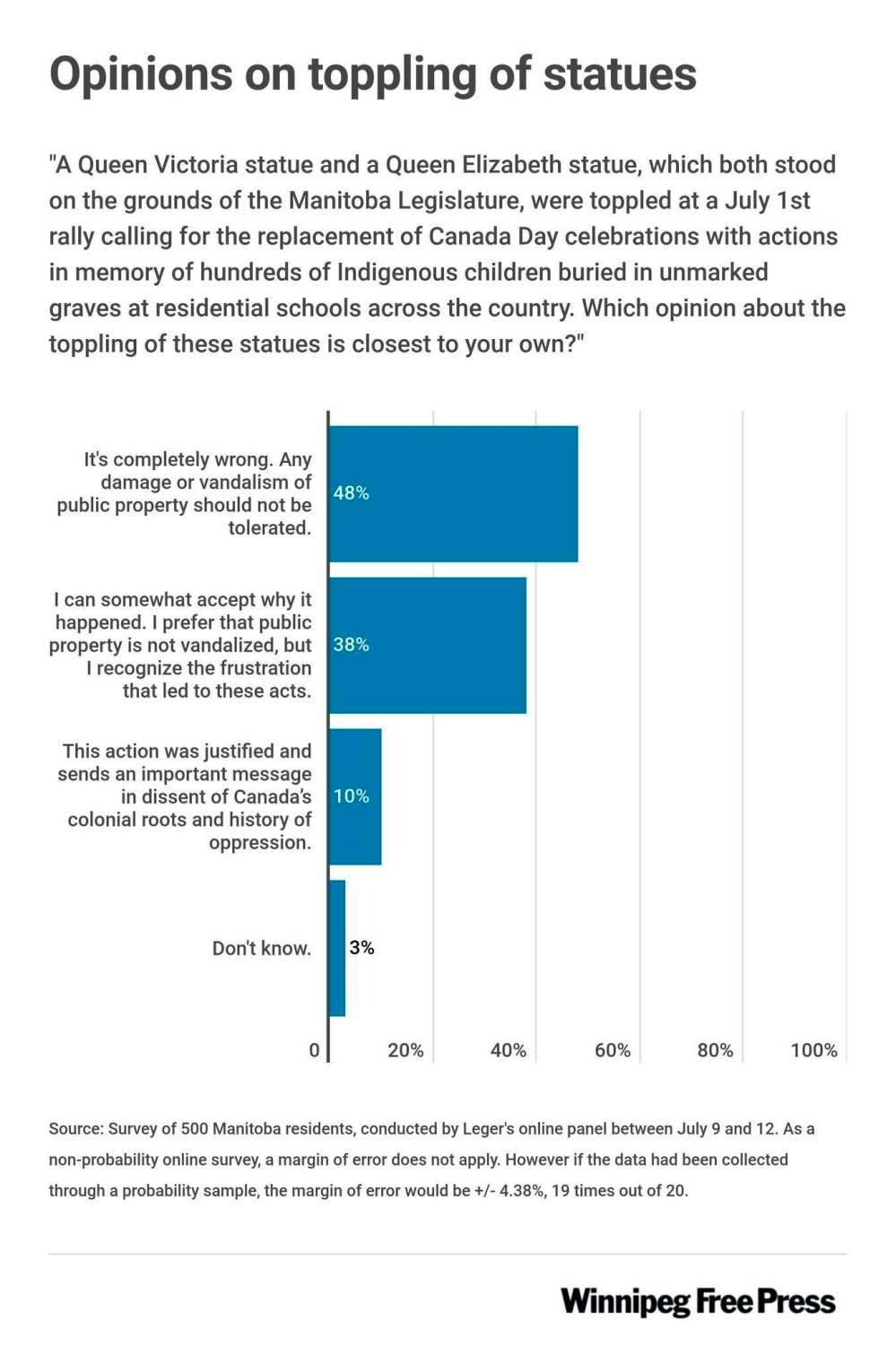 In a survey conducted by Leger for the Winnipeg Free Press, 76 per cent of Manitobans believe acts such the Canada Day protest of tearing down monuments to Queen Victoria and Queen Elizabeth II “hurts the reconciliation process by distracting the public debate.”