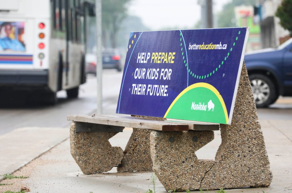In July, ads appeared on Winnipeg buses and bus stop benches, asking Manitobans to “help prepare our kids for their future” and directing them to a government website.