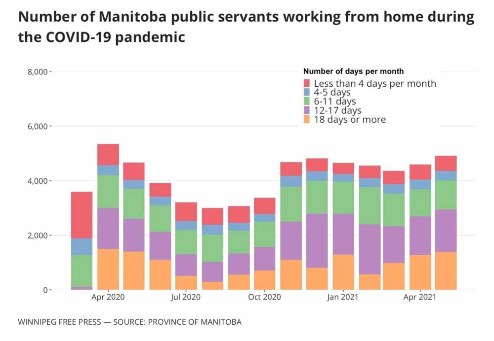 Internal data obtained by the Free Press show 5,029 government employees — 39 per cent of the workforce — were working remotely, in part or in whole, as of June. That’s down from the peak, April 2020, when 5,350 staff worked from home.