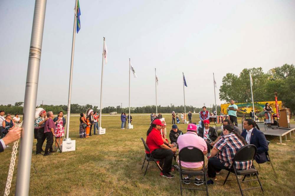 Leaders spoke at an outdoor stage surrounded by nine flags: seven representing the First Nations involved with Treaty No. 1 (Peguis, Sagkeeng, Brokenhead, Roseau River, Long Plain, Sandy Bay and Swan Lake), Canada’s flag, and the Union Jack of the United Kingdom.