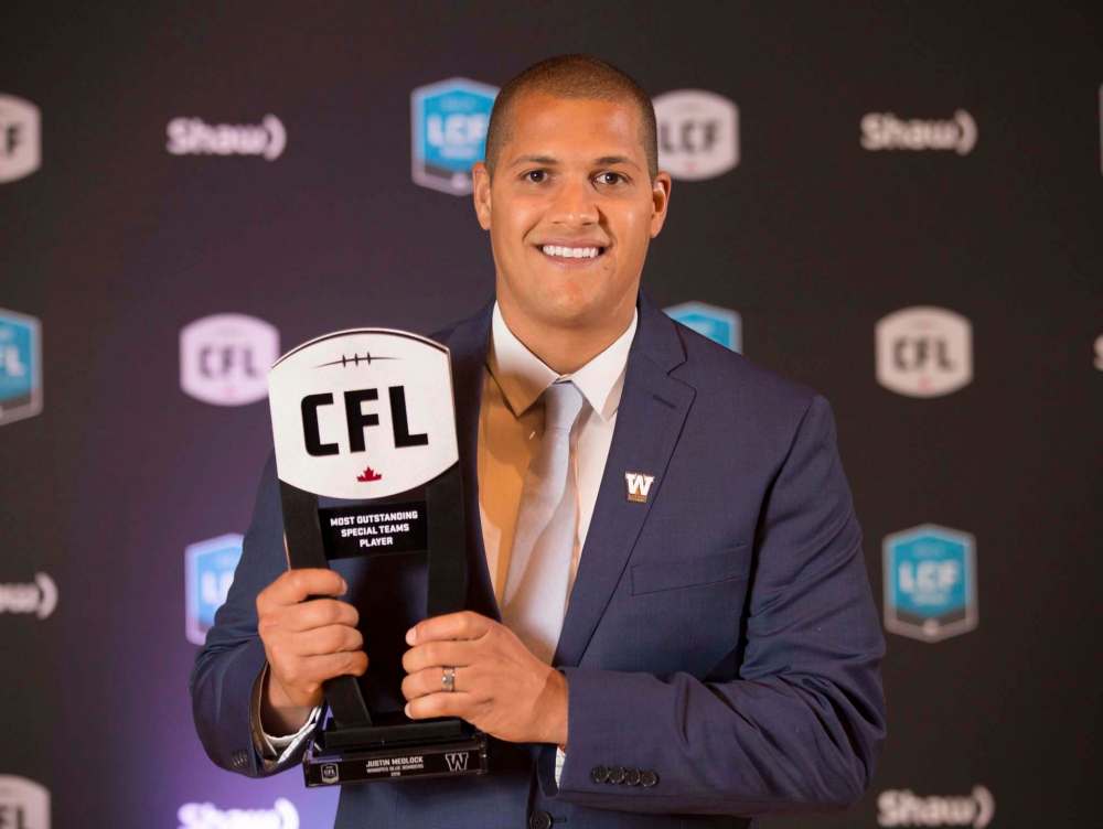 Winnipeg Blue Bombers kicker Justin Medlock poses backstage after being named Most Outstanding Special Teams Player at the CFL Awards held in Toronto on Thursday.