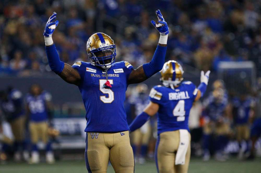 Willie Jefferson (5) and Adam Bighill (4) gets the crowd going against the Hamilton Tiger-Cats during second half CFL action in Winnipeg Thursday, August 5, 2021.