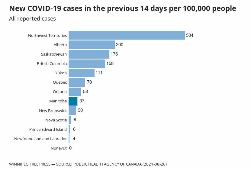 The majority of new cases lately have been reported in the Southern Health region, which has the lowest vaccination rates in the province.