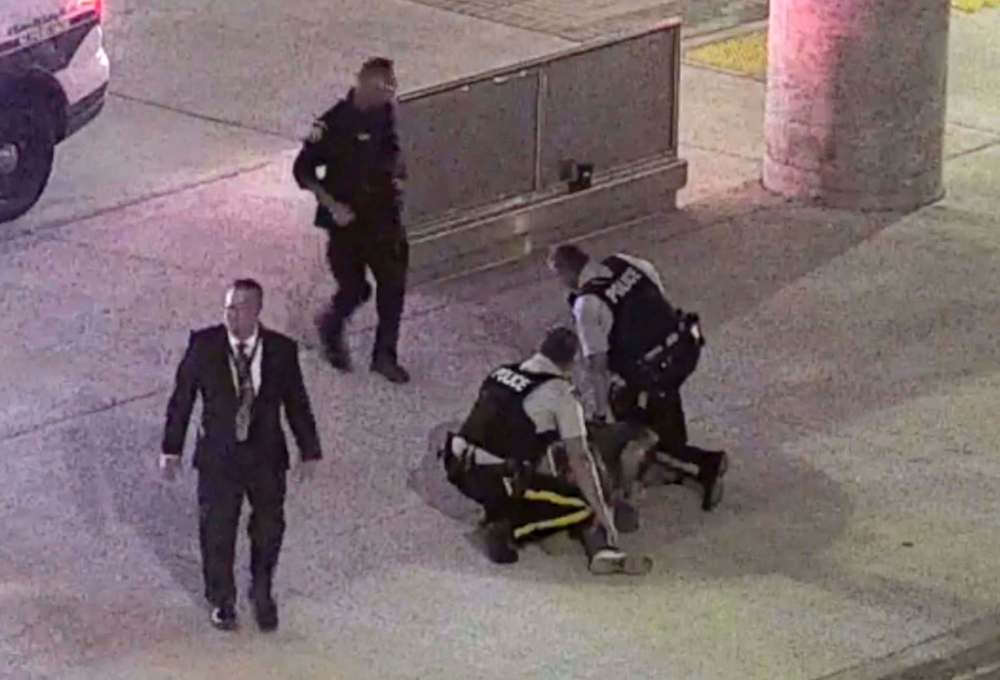 A cellphone video recorded by Lasuik’s father shows Gerein pinning the side of Lasuik’s neck to the ground with his knee, while Dukic pinned his midsection and an airport manager held his legs. Lasuik’s hands were cuffed in front of him and underneath his body.