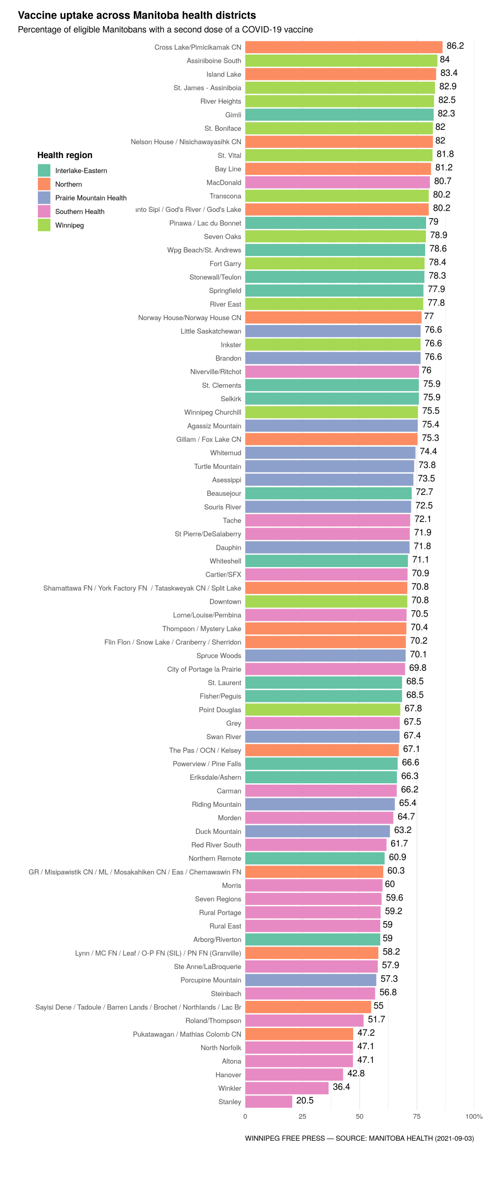 Since then, the percentage of Manitobans over 12 with at least one dose has barely budged to 82.9 per cent from 81.7 per cent – about one-tenth of a percentage point a day. It’s marginally better than the growth rate prior to the announcement.