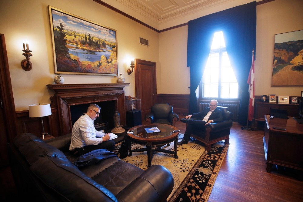 Goertzen pauses, reclining in a leather armchair perched in front of a grand fireplace in the most powerful office in the province.
