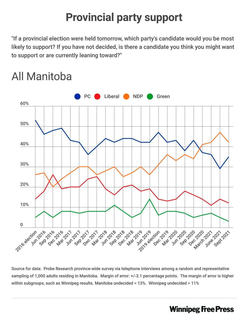 The survey of 1,000 Manitobans, taken Sept. 7-20 — just after Pallister stepped down Sept. 1 and interim Premier Kelvin Goertzen was appointed by the PCs — shows the gap between the Tories and NDP has narrowed to seven percentage points from the high-water mark of 18 percentage points reported in a June survey.