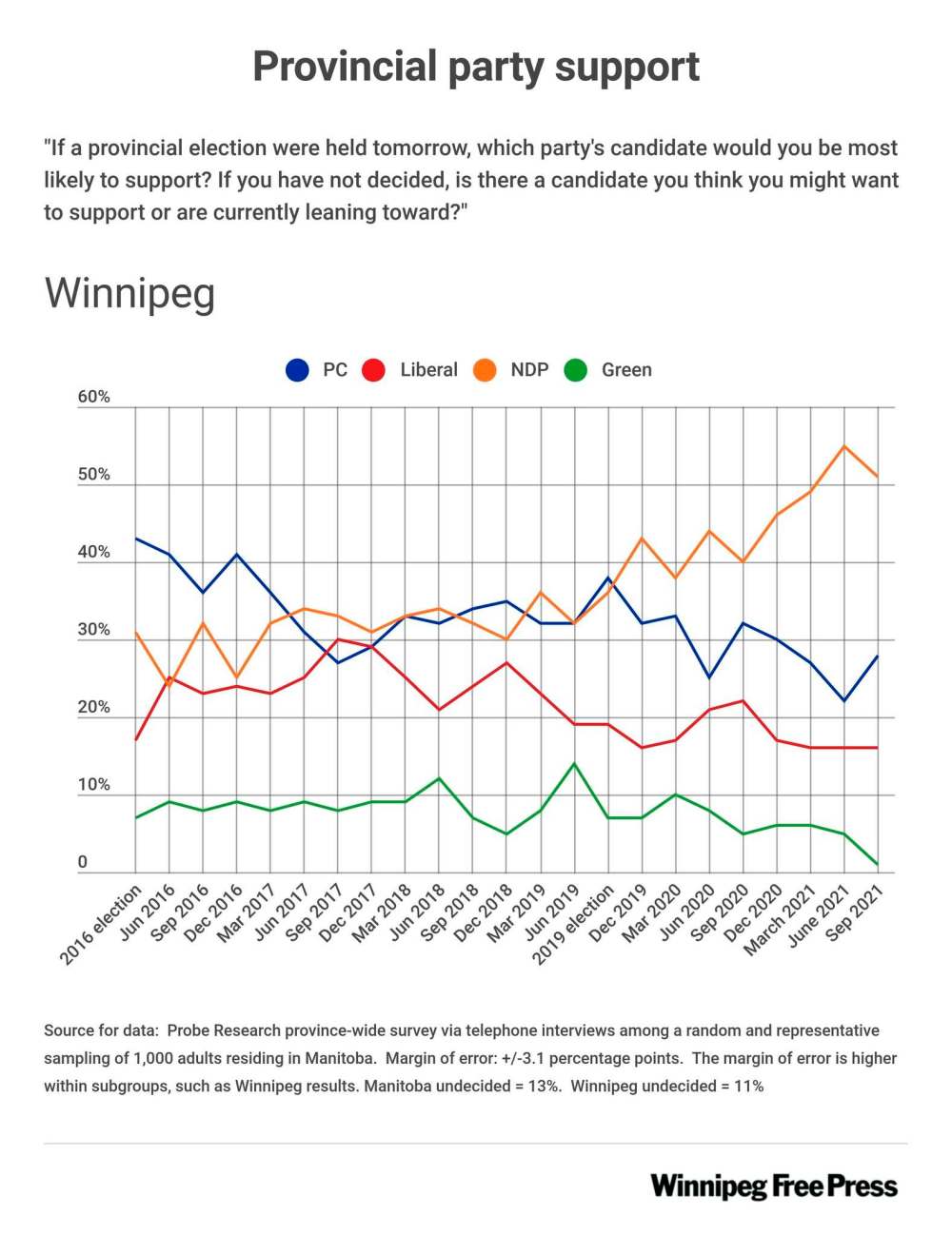 As for the NDP, while provincially there is now only seven percentage points separating it from the Tories, its strength in Winnipeg remains high.