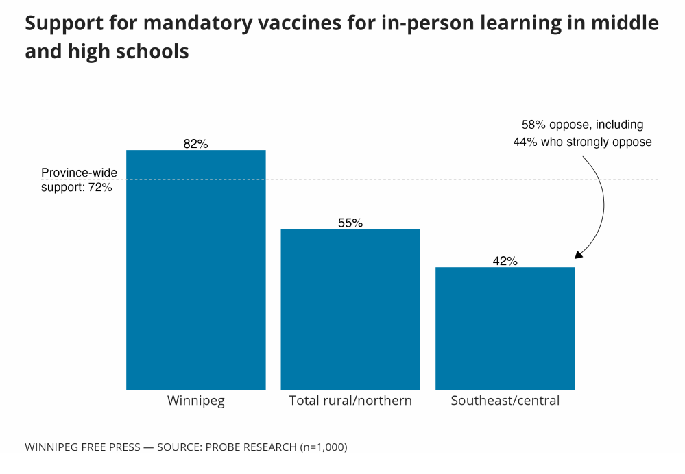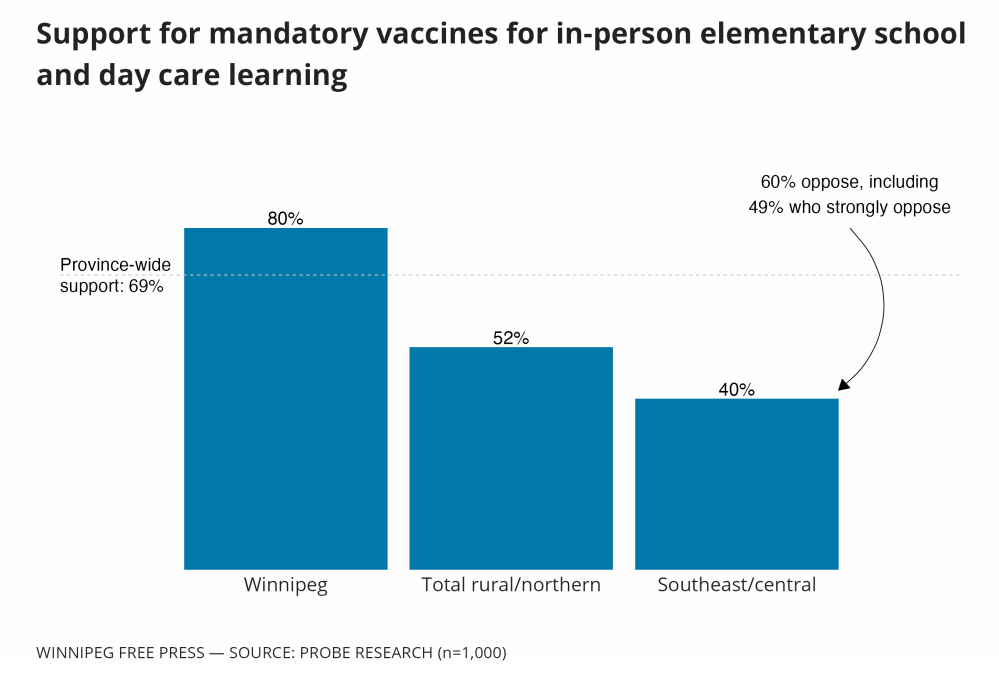 Winnipeggers were much more likely to be supportive of the measure than those who live beyond the Perimeter Highway. Respondents aged 55 and older, and residents with higher levels of education were also most supportive of mandates.