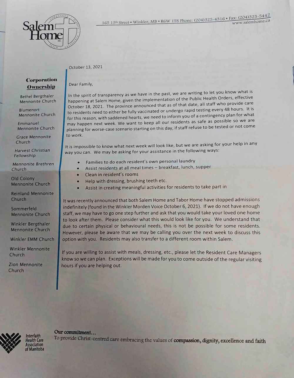 Updated on Friday, October 15, 2021 9:13 AM CDT: Clarifies that Salem Home is a member of the Interfaith Health Care Association of Manitoba