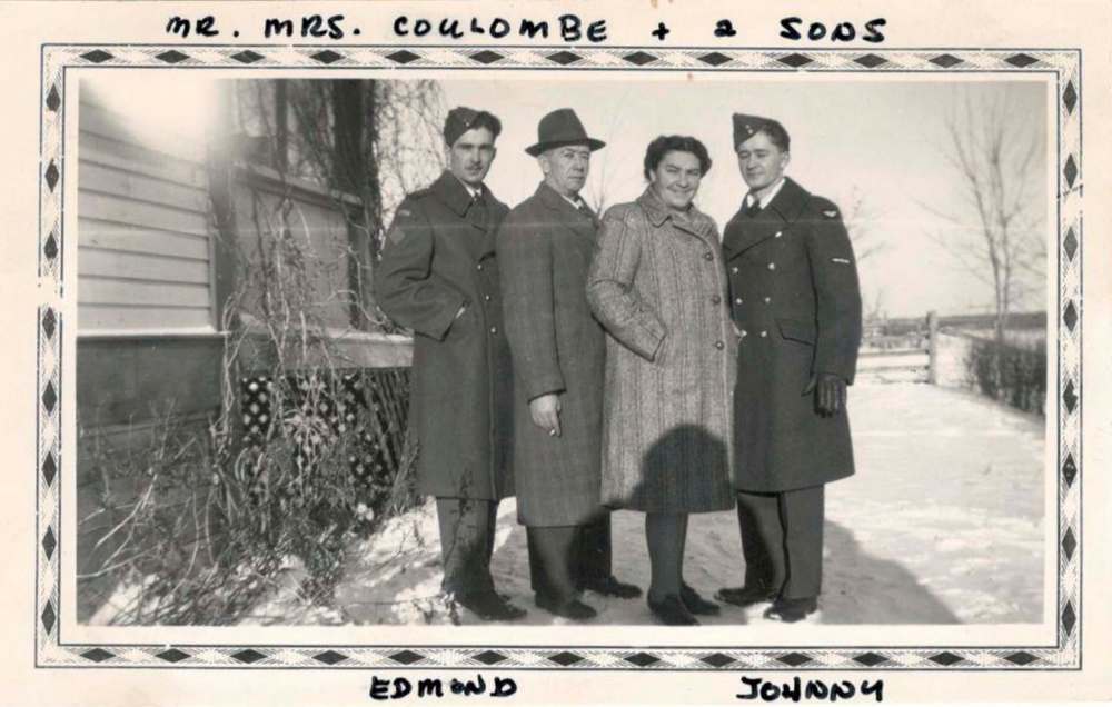 One of the photos shows Coulombe with his parents, Ulric and Yvonne, and brother, Johnny, both in uniform; another shows a uniformed Coulombe with his duffel bag in front of the steps of a building; another has the two uniformed brothers with their sisters, Annette and Juliette, and another woman; while the final photo has the two uniformed brothers standing side by side.
