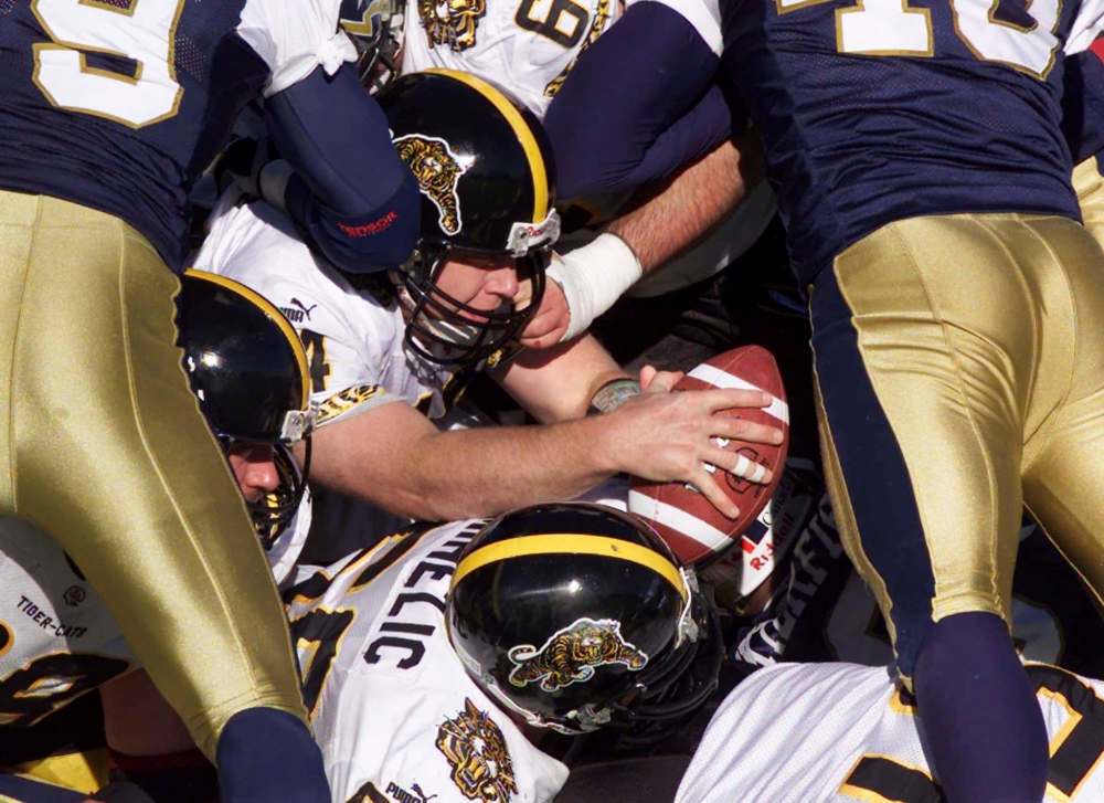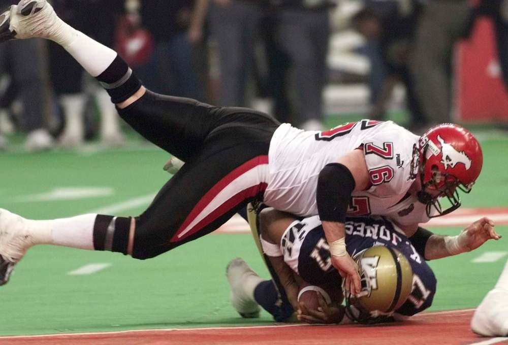 Quarterback Khari Jones, earlier that week named the league’s most outstanding player, took the snap from the shotgun and, almost instantly, felt the heat from Calgary’s pass rush. He quickly stepped up in the pocket to avoid the pressure and prepared to throw a desperate heave to his go-to target, Milt Stegall. Before the ball could leave his hand, Jones was hit from behind and driven into the turf by the CFL’s sack leader, Stampeders defensive end Joe Fleming.