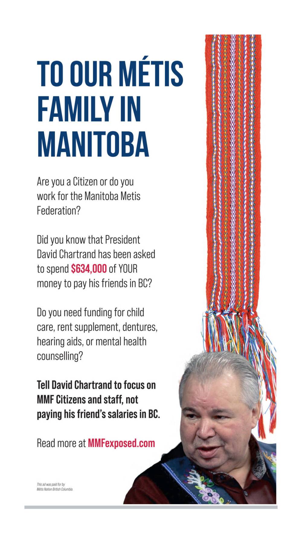 On Friday, Métis Nation British Columbia, which remains part of the national council, took out a full-page ad in the Winnipeg Free Press with the title “MMF exposed,” accusing Chartrand of “paying his friends’ salaries in B.C.” The ad mentions a $634,000 request from a rival upstart group in B.C.
