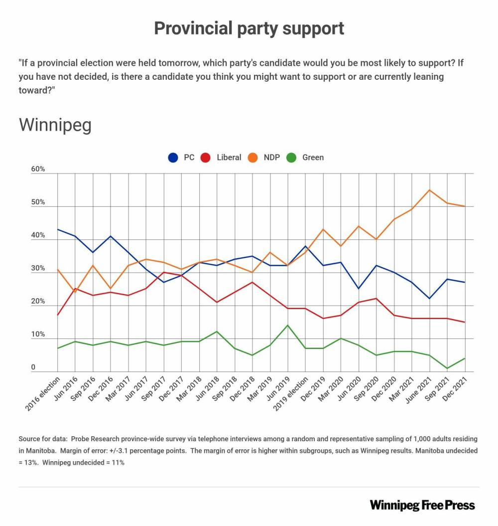 The poll also shows the Manitoba Liberal Party at 12 per cent support provincially, with no change in the number since September and down two per cent since June.