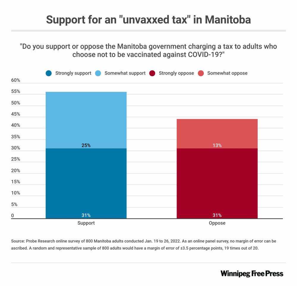 Meanwhile, Manitobans are evenly split on whether to punish people who decide not to be vaccinated with additional taxes.