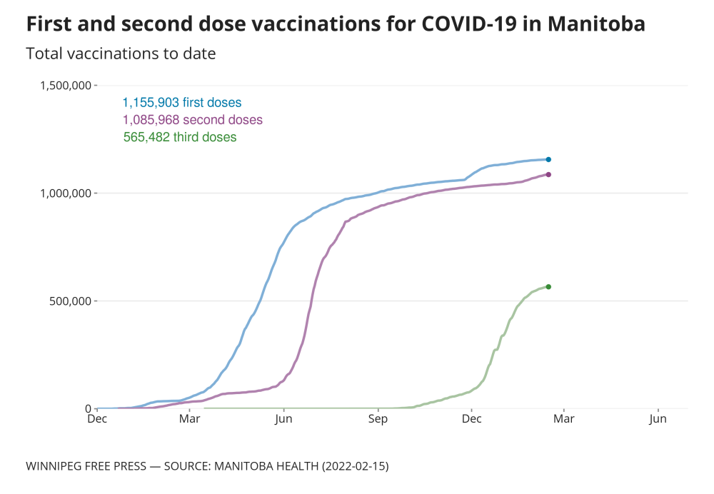 The number of Manitobans with a third dose of the COVID-19 vaccine increased to 565,482 from 469,917, from Jan. 14 to Feb. 14.
