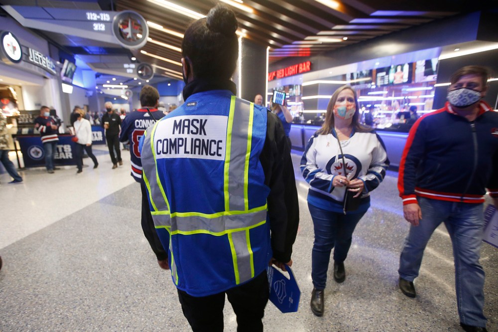 JOHN WOODS / WINNIPEG FREE PRESS JOHN WOODS / WINNIPEG FREE PRESS FILES A member of the Mask Compliance team walks through the Canada Life Centre prior to a Jets game in November. Will True North Sports and Entertainment choose to continue mask mandates in the arena after the province has lifted them?